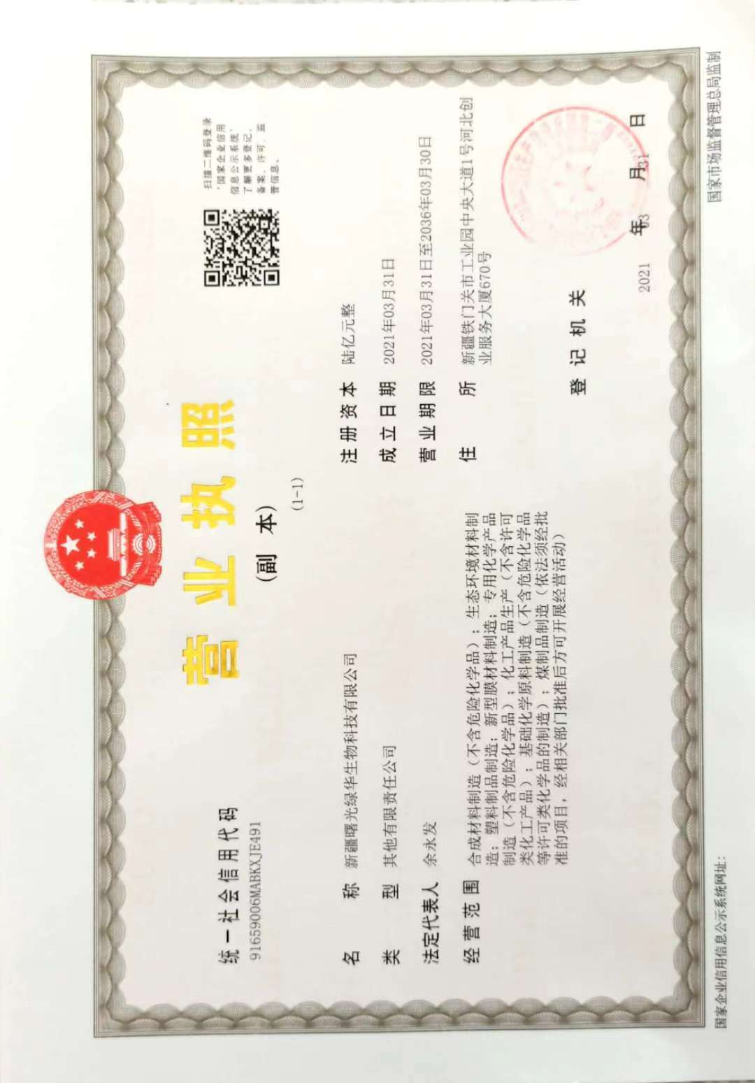 新疆曙光绿华生物科技有限公司由MK官方网站_MK(中国)与安徽曙光化工集团股份有限公司、新疆绿原国有资本投资运营有限公司共同设立,注册资本金15亿元,其中MK官方网站_MK(中国)持股5%。经营范围包括合成材料制造(不含危险化学品)、生态环境材料制造、塑料制品制造、新型膜材料制造、专用化学产品制造(不含危险化学品)、化工产品生产(不含许可类化工产品)、基础化学原料制造(不含危险化学品等许可类化学品的制造)、煤制品制造等业务。